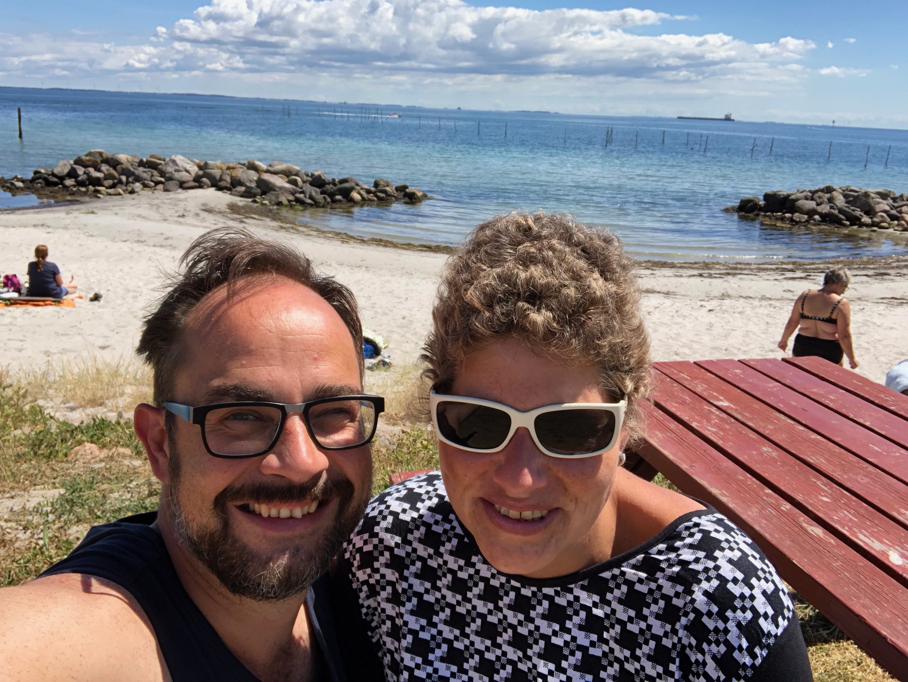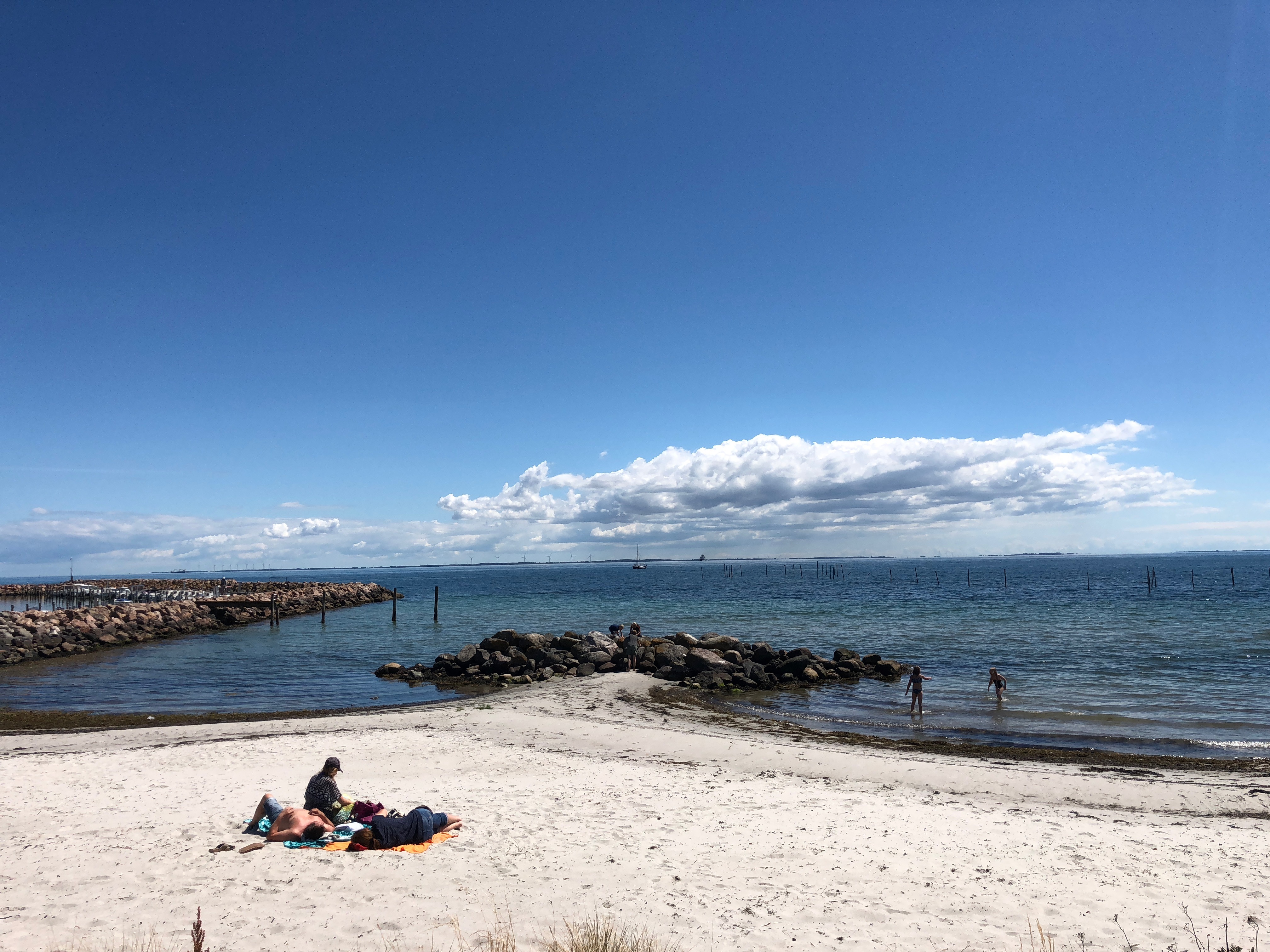 Über eine kleine Brücke ging es am Samstag nach Langeland. Völlig ziellos folgten wir der langen Straße immer geradeaus bis wir an einem Fähranleger in Spodsbjerg landeten. An diesem Tag sollte ein Hafenfest stattfinden, wir suchten uns einen zentralen Parkplatz gegenüber einer Grillbude und setzten uns gemütlich an den Strand. Die Aussicht und der Strand selbst waren phantastisch: