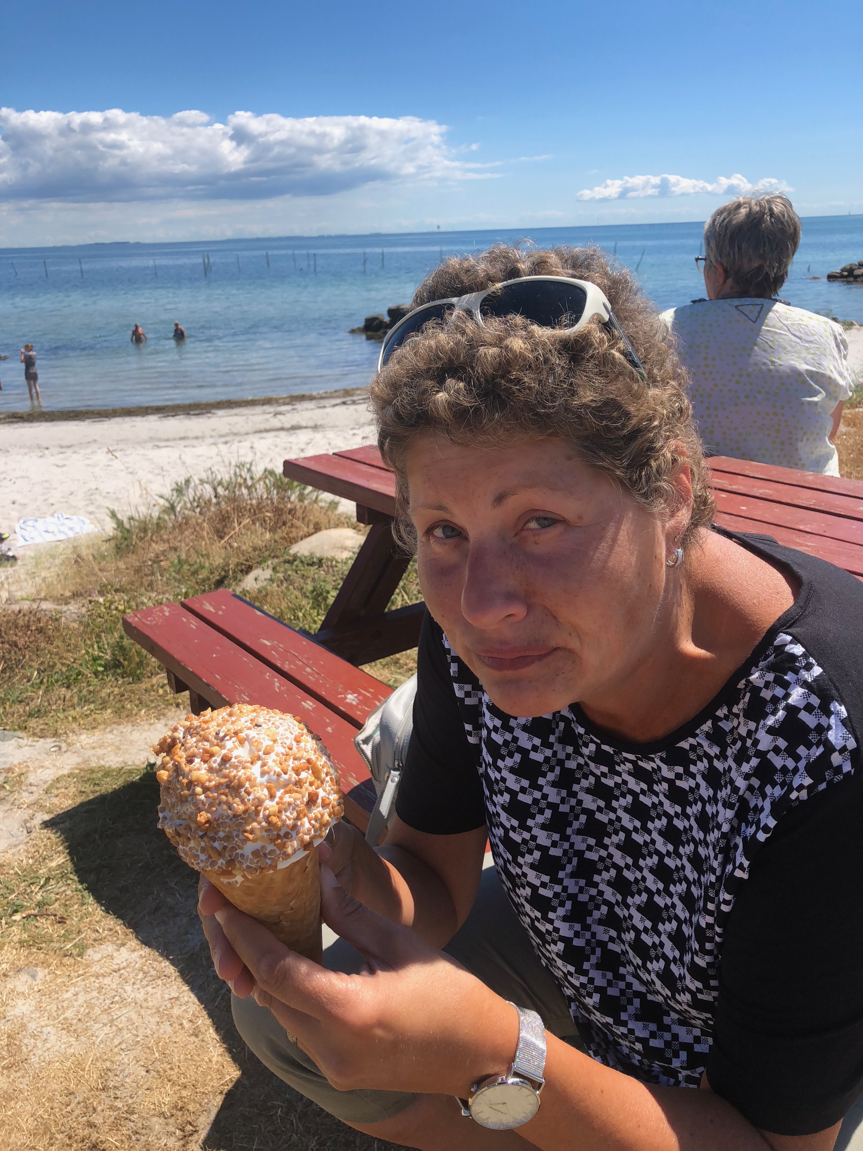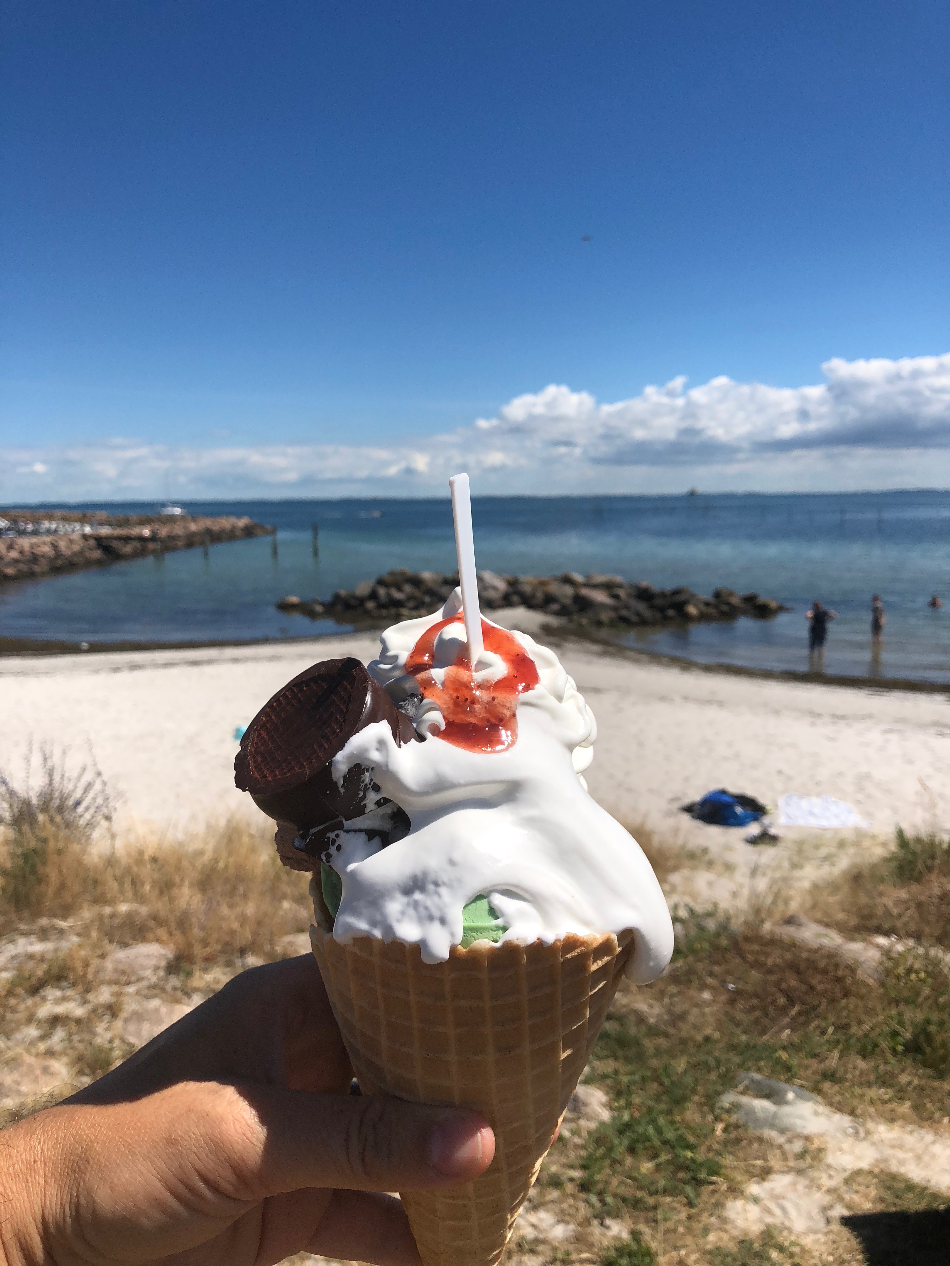 In der erwähnten Grillbude gönnten wir uns noch ein Eis. Während ich warten musste, durfte ich der Bedienung beim Herstellen der Burger zusehen. Bei unserem nächsten Besuch auf Langeland werden wir hier auf jeden Fall noch einmal einkehren und die probieren – die sahen köstlich aus! Großer Patty, zwei Fischfilets, eine doppelte Handvoll Rejer, dann Salat, Soßen etc pp….. Und das alles für 55 dkk – 7,50 EUR. Unser Eis kostete das gleiche und sah so aus: