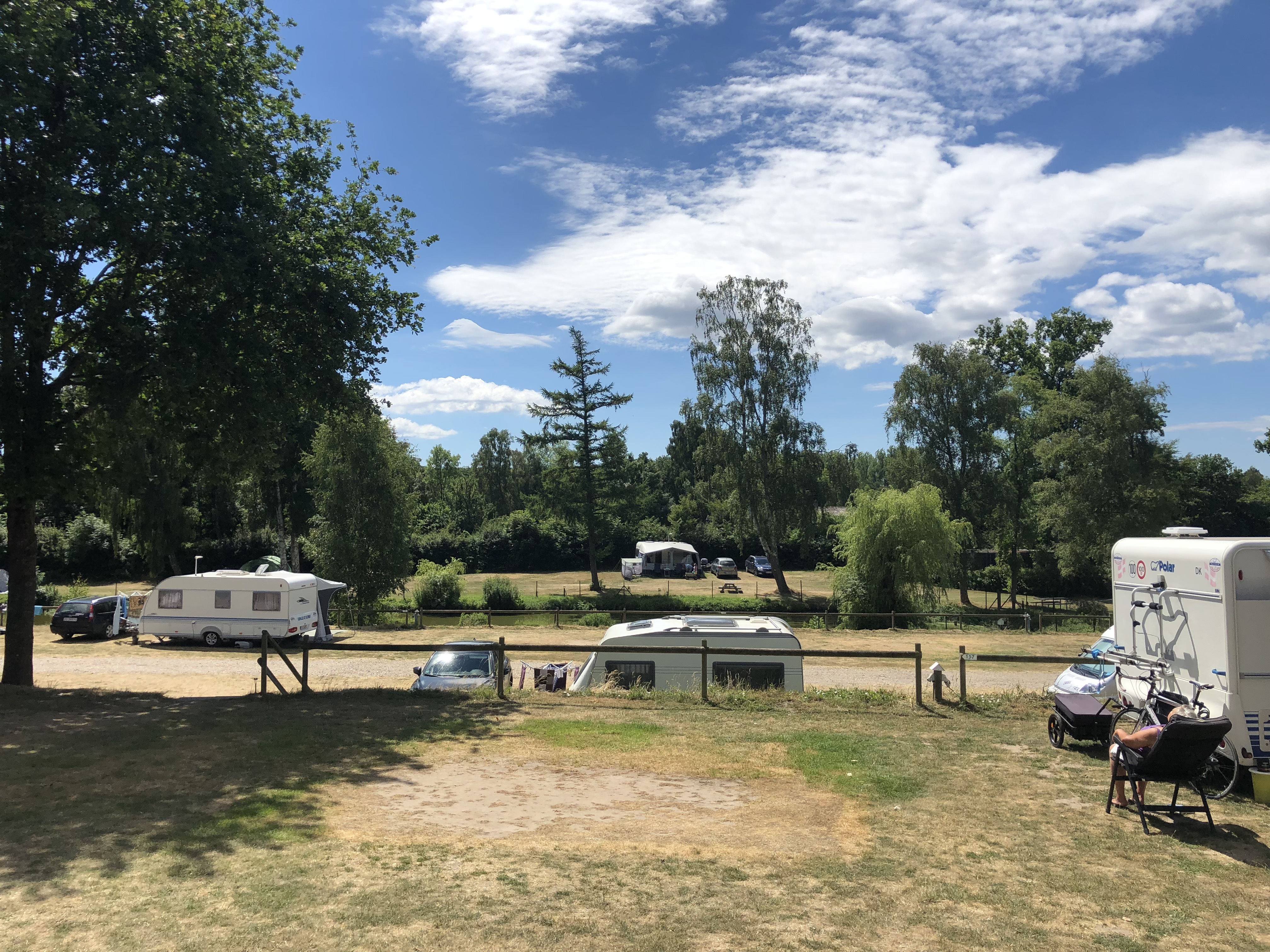 Der Rasen auf der Parzelle war eher nicht vorhanden. Aber es war super ruhig und hyggelig. Die Betreiberin war sehr nett und in ihrem kleinen Kiosk war vieles vorhanden, was man eventuell vergessen haben könnte. Direkt auf dem terassenförmig angelegten vorderen Teil des Platzes war ein großer Teich. Oberhalb des Teichs durften die Autocamper stehen, unterhalb die Zelte – Caravan waren seitlich in einem etwas separierten Bereich. Für uns bedeutete das, dass wir beim Essen meist tierische Besucher hatten. Insbesondere „Kurt“ flüchtete sich immer zu uns, wenn die anderen mal wieder auf ihn einhackten.