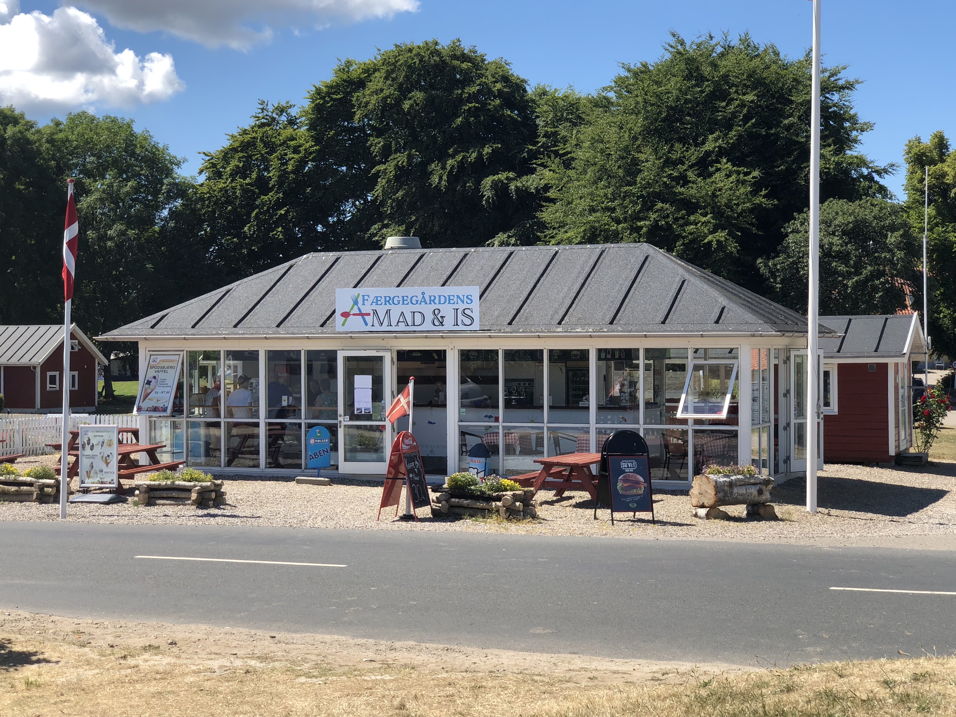 In der erwähnten Grillbude gönnten wir uns noch ein Eis. Während ich warten musste, durfte ich der Bedienung beim Herstellen der Burger zusehen. Bei unserem nächsten Besuch auf Langeland werden wir hier auf jeden Fall noch einmal einkehren und die probieren – die sahen köstlich aus! Großer Patty, zwei Fischfilets, eine doppelte Handvoll Rejer, dann Salat, Soßen etc pp….. Und das alles für 55 dkk – 7,50 EUR. Unser Eis kostete das gleiche und sah so aus: